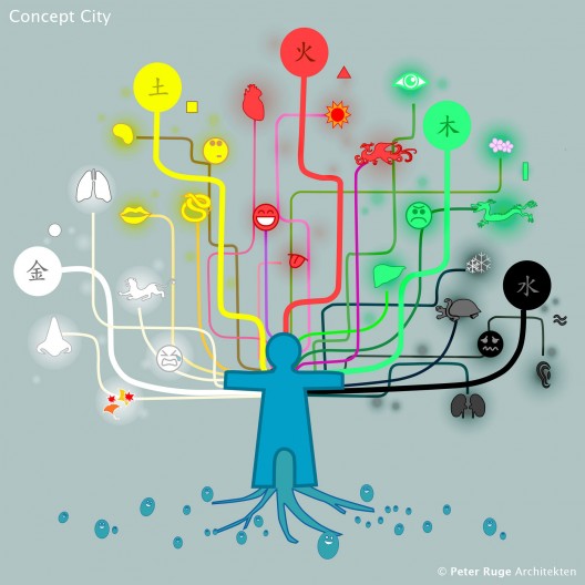 A system of design is guided by concepts related to; 5 Elements – City of Creation; 5 Organs – City of Health; 5 Senses – City of Communication; 5 Islands – City of Relaxation; and 5 Rings – City of Individual Transport. Balance between these cycles and systems are applied to create a harmonious planning arrangement, promoting positive energy flow within each of the island districts and throughout the development as a whole.